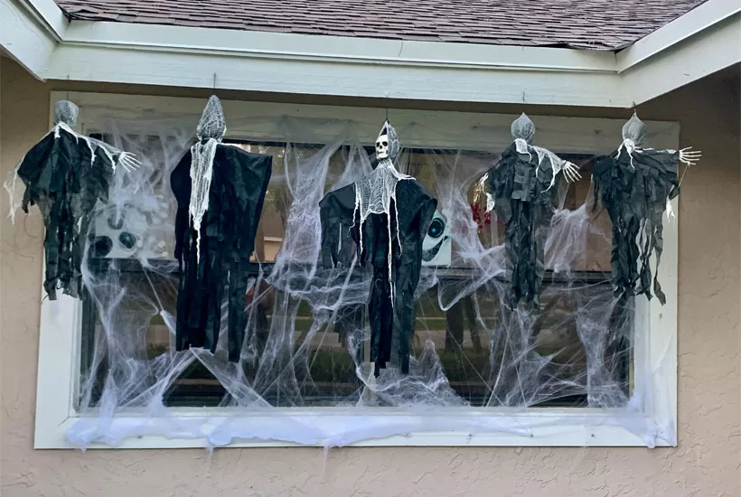 Update: It is 2025, and I am still enjoying turning our patio into a spooky graveyard; however, each year I add something new. Most recently, I added a Halloween window projection that turns my large window into spooky videos for the Halloween season. I get a lot of compliments on this feature. I encourage you to check it out and the easy instructions on how to create your own window projection.